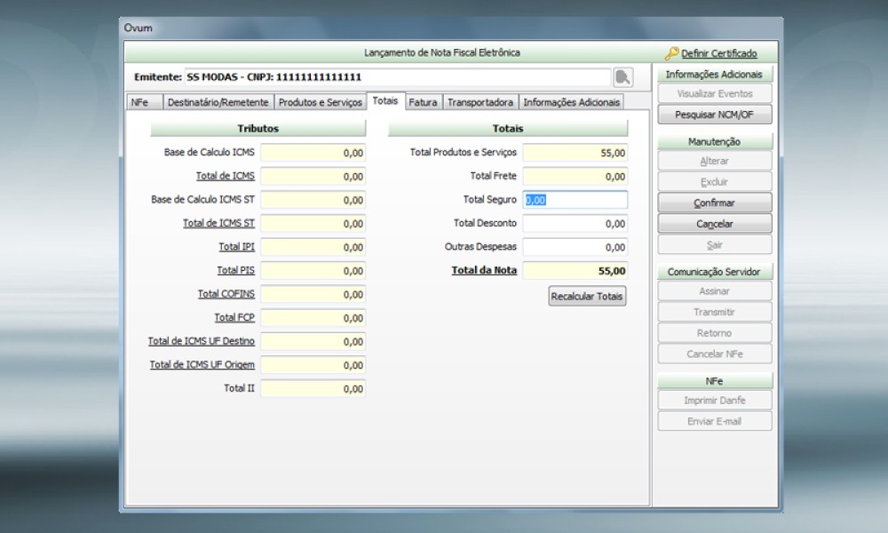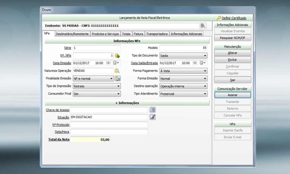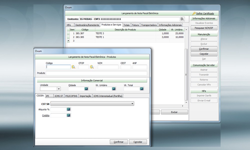 Software desenvolvido para atender qualquer tipo de empresa que necessite da emissão de SAT CF-e (Cupom Fiscal Eletrônico), NF-e (Nota Fiscal Eletrônica), CT-e (Conhecimento de Transporte Eletrônico), MDF-e (Manifesto Eletrônico de Documentos Fiscais).